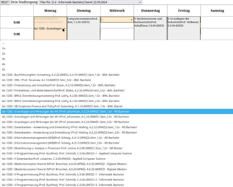 This tool helps to find courses and adjusting your own timetable at University of Applied Sciences Brandenburg. Initially it populates the schedule according to your groups timetable. After that you have the option to see what courses are available at all the different time slots if you want to learn new things from other degrees or other semesters of your own. Furthermore you can replace your own courses with other or remove them if you find them uninteresting or you don’t attend them.